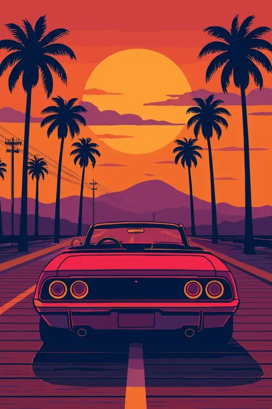 80s Retro Sunset Esthetische Auto posters & art prints door Vicky Hanggara – Premium Poster – 50×70 Vente Directe