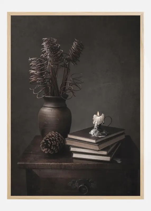 Een dramatische stillevenposter van een kruik, dennenappel, boeken en kaars op een oude houten ladekast. De gedroogde krullen van de plant trekken de aandacht naar het smeltende was en de kaarsvlam. De donkere sepia kleuren geven een mysterieus tintje aan een tijd in het verleden.