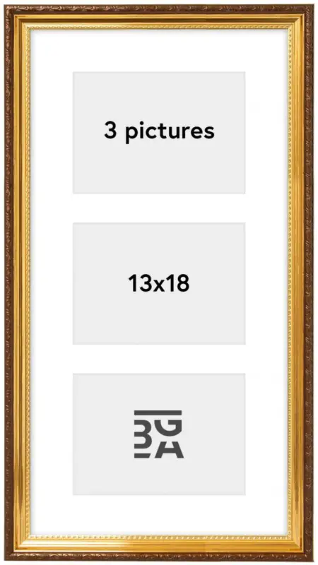 Met deze collagelijst kun je je muur versieren met foto’s van familie, vrienden en herinneringen aan mooie momenten in het leven. De lijst biedt plaats aan 3 foto’s van 13×18 cm. De goudkleurige lijst heeft een mooie retrostijl met een decoratieve buitenrand in een warme bruine tint. Er is een wandbevestiging aanwezig.