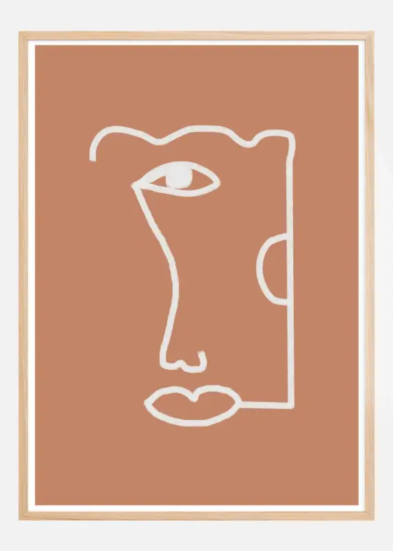 Deze stijlvolle poster benadrukt een abstracte, continue lijntekening van een gezicht, wat een gestileerde en hedendaagse interpretatie van het menselijke portret creëert. De lijn is gemaakt in een contrasterende witte kleur die opvalt tegen een rustgevende terracottakleurige achtergrond. Het eenvoudige, maar toch expressieve gezicht geeft een moderne en minimalistische uitstraling die goed past in een verscheidenheid aan interieurstijlen.