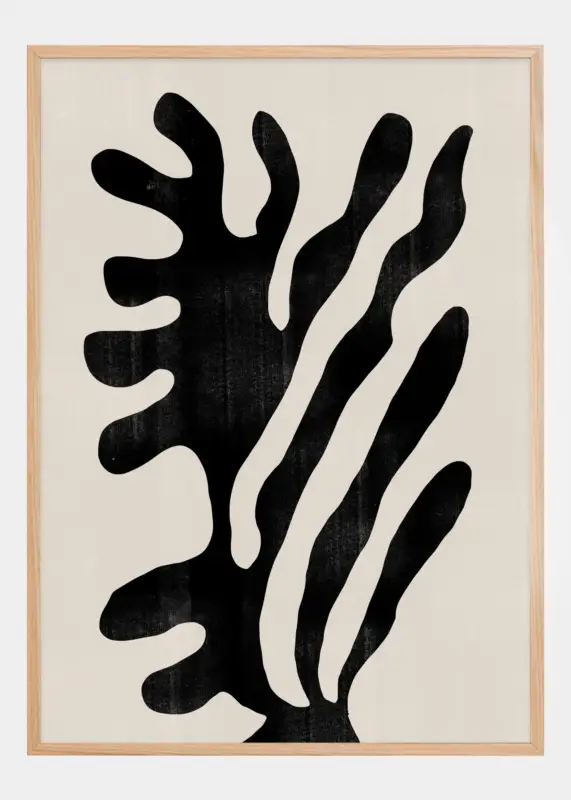 Met een krachtige en abstracte uitdrukking nodigt deze poster uit tot een interpretatie van de levenskracht van de natuur. De gedurfde zwarte vormen, die doen denken aan een blad van een plant of een exotische bloem, contrasteren met de roomwitte achtergrond en creëren een dynamisch en dramatisch effect. Dit kunstwerk vangt de organische schoonheid van de natuur door middel van een minimalistische maar gedurfde taal.