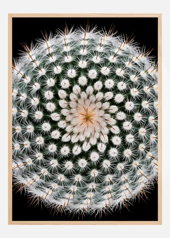 Een luchtposter van een cactus met witte bloemen. Op een zwarte achtergrond versterkt het donkergroen de witte bloemen en de stekelige stekels. Het centrale deel van de plant heeft een lichtgele toets, wat de poster net dat beetje extra kleur geeft. Een ideale poster voor iedereen die van planten houdt.