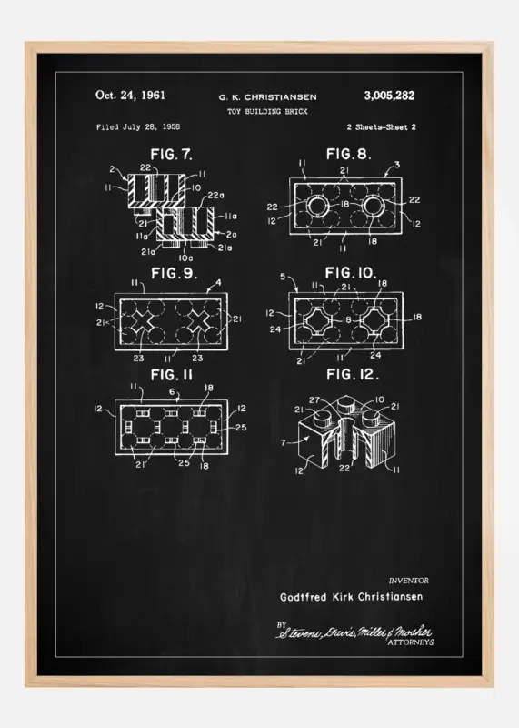 Deze patentposter is een eerbetoon aan een van de meest iconische uitvindingen in de speelgoedwereld, gecreëerd door de uitvinder Godtfred Kirk Christiansen. Met patentnummer 3,005,282, verleend op 24 oktober 1961, toont deze poster de gedetailleerde constructietekeningen van de klassieke speelgoedbouwsteen van LEGO. Het is een fantastische weergave van de geschiedenis en het ontwerp van speelgoed die generaties van creatieve bouwers verbindt.