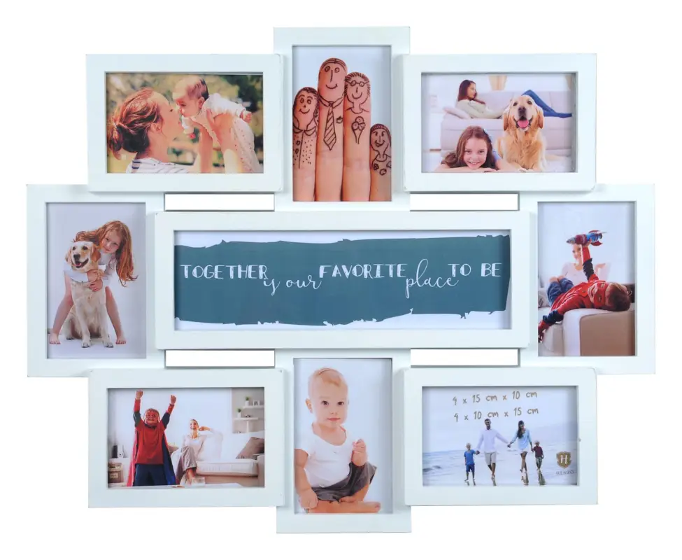Verzamel je mooiste foto’s in een mooie collagelijst! Deze fotolijst is niet alleen mooi om te zien, de lijst heeft ook nog eens verschillende, verwisselbare designs! Er worden namelijk 5 lieve teksten met verschillende onderwerpen meegeleverd, die je in de middelste (9e) lijst kunt plaatsen (en dus kunt wisselen wanneer je wilt). Je kunt bijvoorbeeld de tekst “All you need is love” gebruiken, of “Say yes to family”. De collagelijst is verkrijgbaar in wit en zwart.