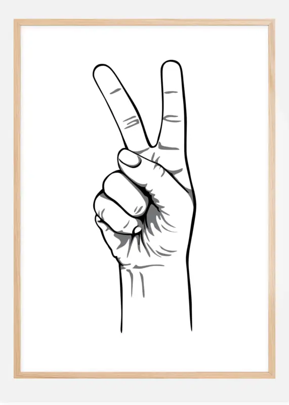 Een zwart-wit poster van een hand die het vredesteken voorstelt. Aangebracht op een witte achtergrond, zijn de wijs- en middelvinger omhoog gestoken, terwijl de andere door de duim worden vastgehouden. De perfecte poster om een boodschap van vrede over te brengen en te promoten.