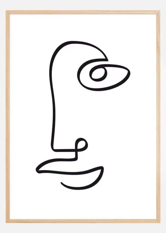 Een abstracte poster van een gezicht met zwarte lijnen. De eenvoudige zwarte lijn kronkelt rond het stuk om één kant van een gezicht te creëren zonder het papier te verlaten. Als je dit eenvoudige beeld thuis ophangt, kun je er zelfs andere beelden in zien.