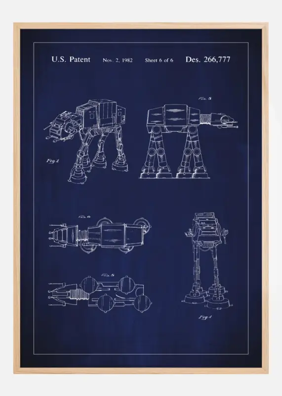 Deze kunstzinnige patentposter afbeeldt de onderscheidende constructietekeningen van het beroemde designpatent Des. 266,777, geregistreerd op 2 november 1982. Het motief toont technische tekeningen van een ATAT uit Star Wars in meerdere weergaven, ieder die de unieke structuur en functies van het apparaat demonstreert. Het wordt gepresenteerd tegen een diepblauwe achtergrond, wat een elegant en modern uitdrukking geeft aan de witgelijnde illustraties.