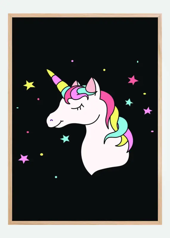 Een schattige poster van een kinderlijke witte eenhoorn op een zwarte achtergrond. De eenhoorn heeft roze, gele en turquoise manen en een hoorn. Sterren in dezelfde kleuren vullen de zwarte achtergrond erachter om een leuke prinsessen vibe te creëren. Voeg deze poster toe aan de slaapkamer van je kind voor een leuke eigenzinnige afbeelding die de fantasie van je kind doet opborrelen.
