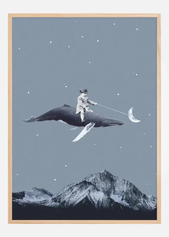Deze creatieve en inspirerende poster toont een jonge ontdekkingsreiziger die, rijdend op een walvis, de maan vangt met een stok. Het symboliseert de zoektocht en de droom om het onmogelijke te bereiken. De sterrenhemel en het robuuste berglandschap eronder geven een gevoel van avontuur en verkenning in het grote onbekende.