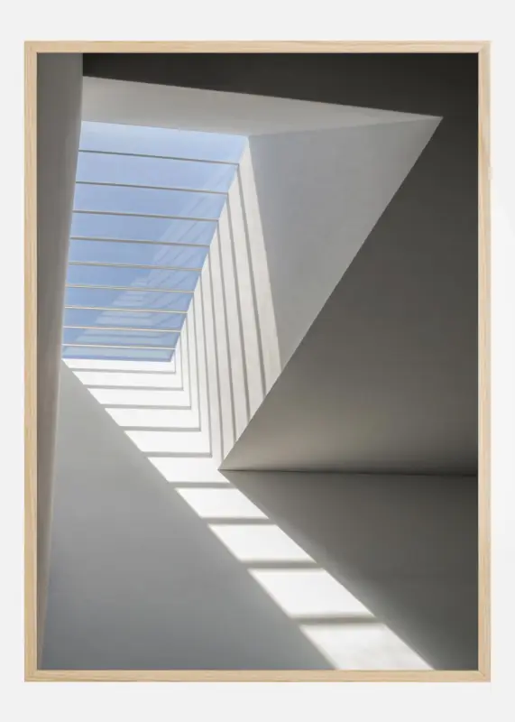 Een eenvoudige luchtige poster van een helder wit kamerinterieur. Links is een dakkapel met een blauwe lucht te zien. Het licht dat er doorheen valt, werpt schaduwen die eruit zien als een ladder die de blik naar boven leidt naar het licht buiten. Voeg helderheid toe aan een donkere kamer met dit vredige beeld.