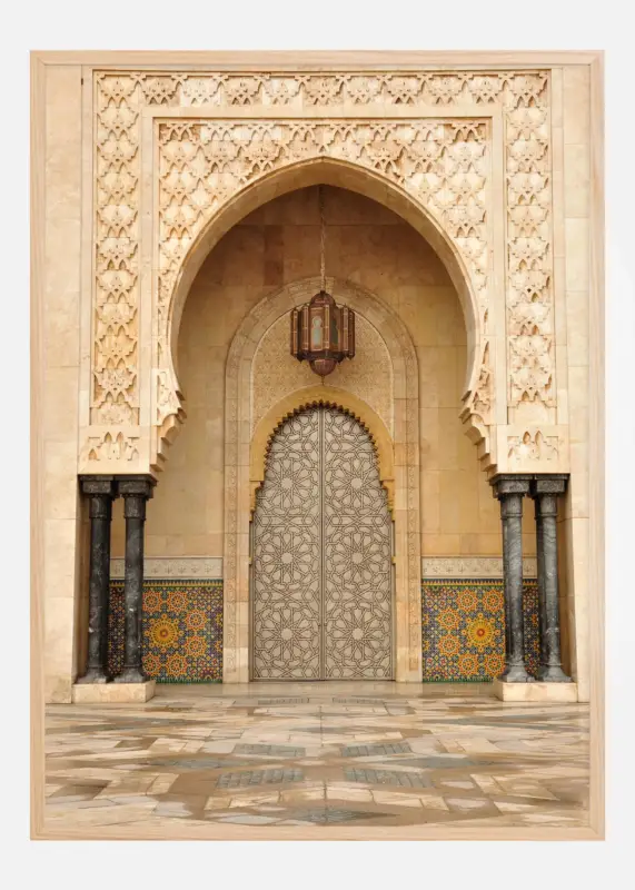 Deze poster vangt de grootsheid van de architectuur van een poort bij Alhambra, een meesterwerk van Moorse design. De indrukwekkende ingang met haar uitgesneden details en steenwerk, gecombineerd met kleurrijke tegels, geeft een gevoel van historische pracht en culturele rijkdom. Elk detail in het beeld, van de verfijnde patronen tot de diepe structuur van de kolommen, benadrukt het vakmanschap en de artistieke vaardigheid die de islamitische architectuur kenmerken.