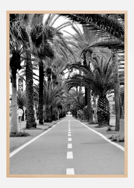 Een landschapsposter van een stuk weg dat door een bosje palmbomen loopt. De palmen vormen de rand van de weg terwijl de witte lijnen je naar de verte leiden. De bomen vormen een boog die jouw ogen naar binnen leidt. Voeg dit mooie zwart-wit beeld toe aan jouw muur voor een exotische vibe.