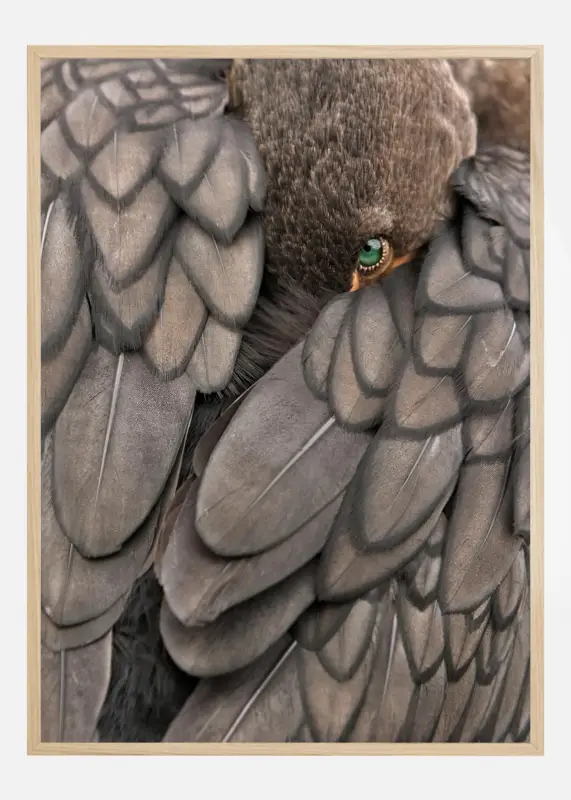 Deze betoverende poster vangt het moment van intimiteit in de natuur door de close-up van een vogel, waarbij zijn schitterende groene oog glanst als een smaragd ingebed tussen de grijze tinten van de veren. Elke veer is met precisie gesneden, wat een gevoel van de elegante vorm en structuur van de vogel oproept. Het is een werk dat zowel tot vogelliefhebbers als kunstenaars spreekt, en tot degenen die de subtiele schoonheid van de natuur waarderen.