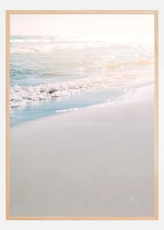 Een close-up poster van kabbelende golven tegen een zandstrand. Schuimende golven slaan tegen het gladde zand terwijl helder wit licht het wateroppervlak doet glinsteren voor een magisch gevoel in de vroege ochtend. Zacht blauw, roze en geel maken deze poster tot de perfecte aanvulling voor de slaapkamer.