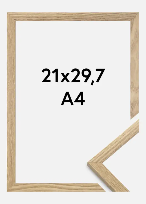 De lijst is gemaakt van MDF-materiaal met een fineer van eikenhout en heeft een dun profiel van 14 mm. Er is voldoende ruimte om je afbeeldingen aan te vullen met een luxe passe-partout, dankzij de 12 mm binnendiepte (sponningdiepte) van de lijst.
