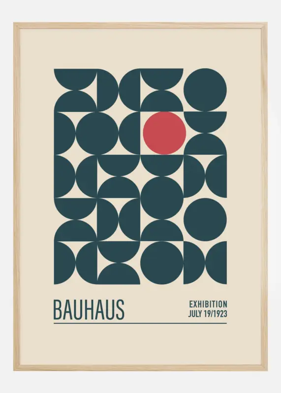 Deze poster vangt de minimalistische essentie van de Bauhaus-beweging en de nadruk op geometrie en kleur. De grafische compositie bestaat uit overlappende cirkels in verschillende tinten blauw met een accentuerende rode cirkel, die een dynamische en toch evenwichtige visuele ervaring creëert. De tekst “BAUHAUS EXHIBITION JULY 19/1923” verwijst naar de tentoonstellingen van de historische designschool die baanbrekend waren voor modern design.