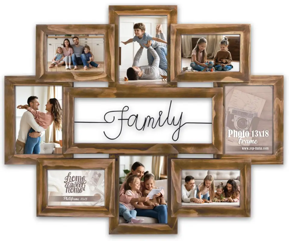 Deze mooie collagelijst is perfect om je dierbaarste herinneringen van je familie te verzamelen en in te lijsten! De collagefotolijst heeft een warme bruine houtkleur. In het midden staat het woord “Family” in zwarte letters. De lijst heeft ruimte voor 8 afbeeldingen in fotoformaat 10×15 cm en 13×18 cm en heeft wandbevestiging.