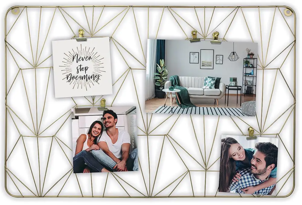 Collagelijst ontworpen als een prikbord waar je je foto’s met klemmen vast maakt. De lijst is gemaakt van metaal en heeft een mooie gouden kleur. Omdat je je foto’s in de klemmen plaatst, kun je ervoor kiezen om verschillende formaten te mixen en bijvoorbeeld kleinere posters of leuke notities bij te voegen. Laat je creativiteit de vrije loop! De lijst meet 62×41 cm in buitenmaten en heeft wandbevestiging. Deze collagefotolijst past goed boven het bureau, in de keuken of elders waar het tot zijn decoratieve en functionele recht komt.