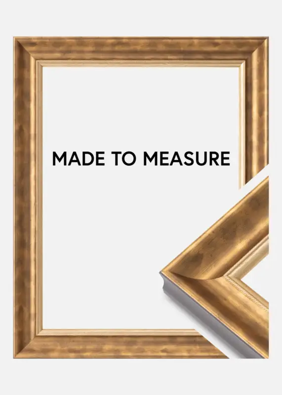 Mooie fotolijst in een formaat naar keuze met een prachtig antiek-gouden profiel en koperen elementen. Het brede en diepe profiel zorgt ervoor dat deze lijst gegarandeerd op zal vallen.
