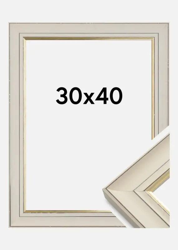 Fotolijst in klassieke stijl met een spannend retrogevoel. De fotolijst heeft een versleten wit profiel met een mooie gouden rand langs de afbeelding. Dankzij het neutrale design en de kleurencombinatie is dit een fotolijst die in bijna alle interieurs en bij alle soorten afbeeldingen past.