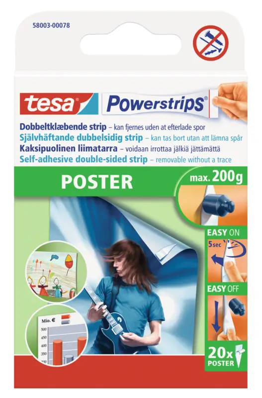Tesa Zelfklevende Strips is een praktische set van 20 dubbelzijdige strips die het eenvoudig maken om voorwerpen te monteren zonder de muur te beschadigen. Perfect voor het ophangen van lijsten, decoraties en andere lichte objecten. Een handige oplossing voor thuis en op kantoor.