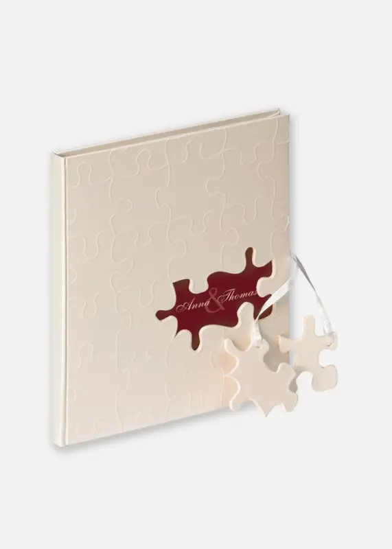 Gastenboek met witte en rode linnen kaft. Op de voorkant van het gastenboek is ruimte voor een persoonlijke foto of de naam van het bruidspaar. Een bijpassend trouwalbum voor je trouwfoto’s is ook verkrijgbaar.