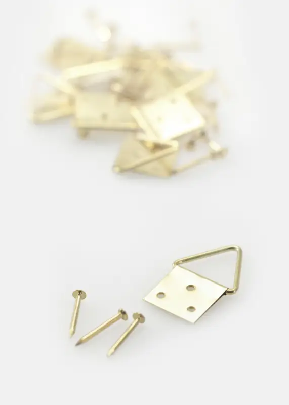 Posterhaakje van messing. Vast te spijkeren op de achterzijde van de lijst. Je kunt er één gebruiken of twee in combinatie met posterdraad. Deze posterhaakjes zijn geschikt voor iets grotere schilderijen (max. afmeting: 60×90 cm)