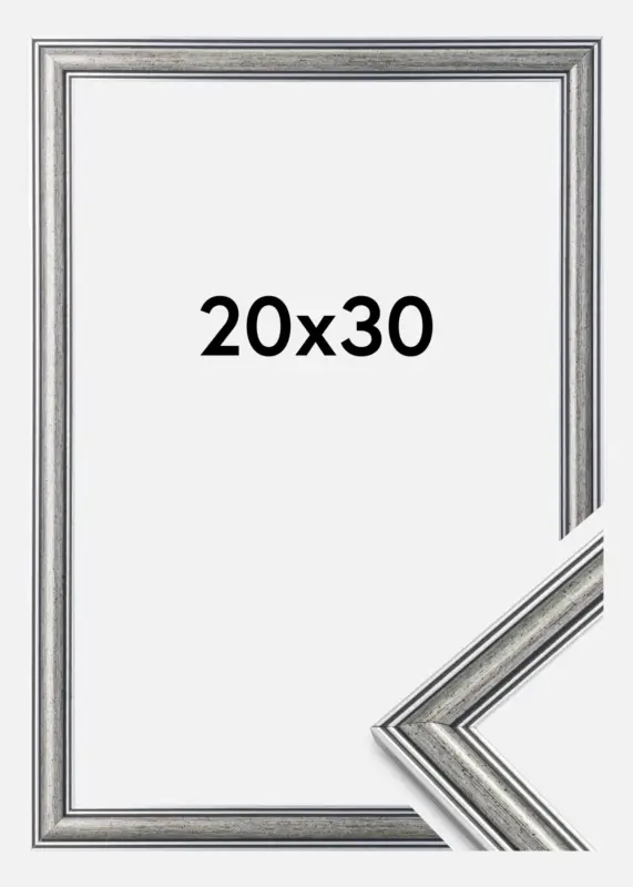 Frigg is eenzilveren lijst met zwarte lijnen en een zwartgespikkelde inslag. Past uitstekend wanneer je zoekt naar een brede klassieke zilveren lijst die goed past bij verschillende soorten foto’s en ruimtes.