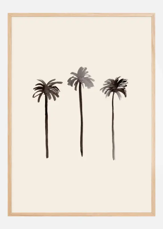 Een eenvoudige zwart-wit poster van drie palmbomen op een rij. Op een beige achtergrond zijn verschillende tinten zwart gebruikt om de bladeren donkerder te maken. Een vredige poster om aan de muur van je woonkamer te hangen.