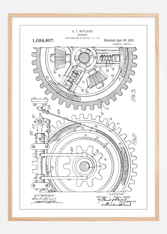 Versier je muur met deze klassieke patentposter die het ingewikkelde versnellingsbakontwerp van A. I. Hovland presenteert, patentnummer 1,024,897, verleend op 30 april 1912. Deze gedetailleerde tekening benadrukt de technische vaardigheid en complexiteit van vroege mechanische ontwerpen. De sierlijke lijnen en nauwkeurige details in deze patenttekening bieden een dieper inzicht in de geschiedenis van de ingenieurskunst en zijn een statige aanvulling op elke technische of industriële interieurstijl.