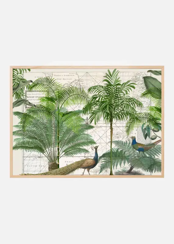 Deze elegante poster vangt de schoonheid van de natuur met een motief van prachtige pauwen en weelderige vegetatie. Twee trotse pauwen staan tussen dichte palmen en varens, wat zorgt voor een harmonieuze en exotische sfeer. Op de achtergrond zie je een kaart, die een gevoel van avontuur en ontdekkingsreizen oproept. Door deze elementen te combineren krijgt deze poster een verfijnde en unieke uitstraling, perfect om elk interieur tot leven te brengen.