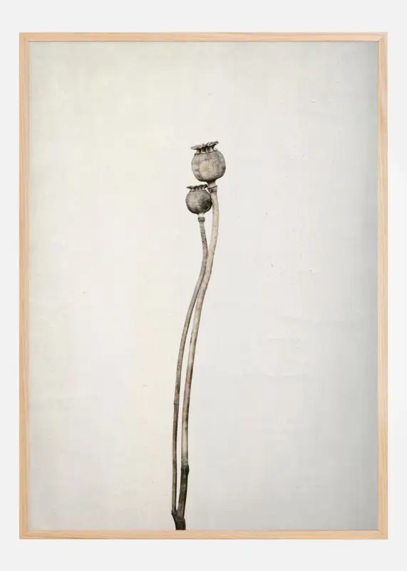 Een bloemenposter van twee zaadkoppen van klaprozen die in een dans verstrengeld zijn. De zwart-wit poster laat deze twee langstelige klaprozen twisten tegen een witte achtergrond. Deze elegante dans trekt de aandacht terwijl de papaverkoppen zich klaarmaken om uit te barsten en hun zaden te verspreiden om nieuwe bloemen te laten groeien.