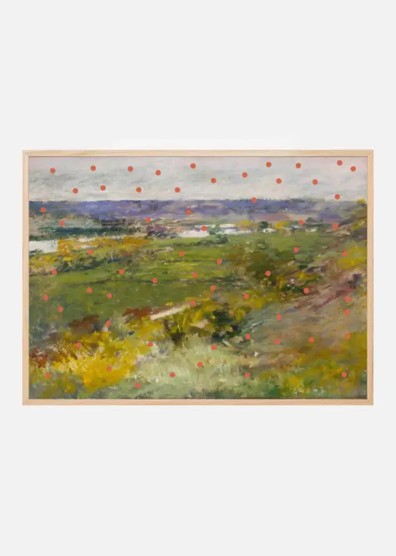 Deze poster is uniek door de opvallende oranje stippen die een speels en eigentijds element toevoegen. De plaatsing van de stippen zorgt voor een boeiend contrast met de natuurlijke kleuren op de achtergrond, waardoor deze print een gespreksonderwerp wordt en een stijlvol accent vormt in elk modern interieur. Een decoratieve poster die op meesterlijke wijze het traditionele en het moderne samenbrengt.