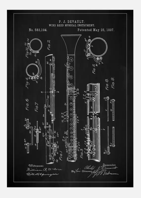 Usine Directe Patent Print – Clarinet – Black Canvasprint (30×40 cm)