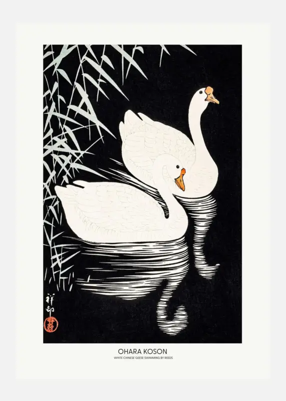 Usine Directe White Chinese Geese Swimming By Reeds Canvasprint (30×40 cm)