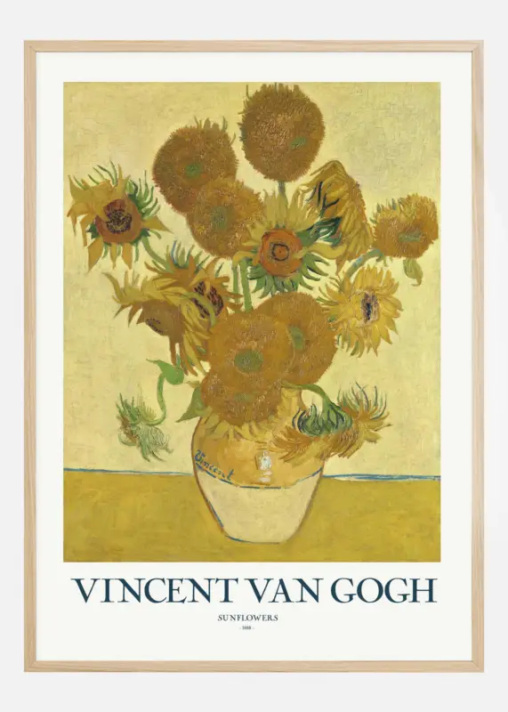Deze warme en heldere poster beeldt Vincent van Goghs beroemde schilderij “Zonnebloemen” uit 1888 af. Met zijn levendige gele en gouden palet vangt van Gogh de schoonheid en eenvoud van deze bloemen in een keramische vaas. Van Goghs karakteristieke penseelstreken en het gebruik van kleur geven diepte en textuur aan de bloembladen en brengen de hele compositie tot leven.