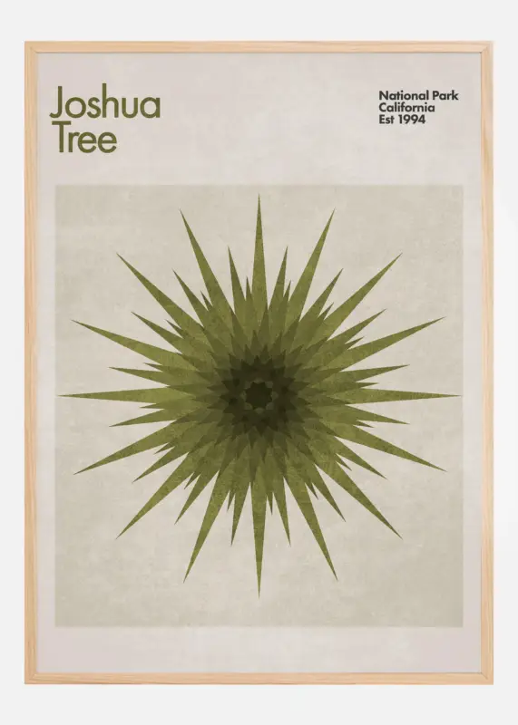 Deze sfeervolle poster toont een abstracte interpretatie van de iconische Joshua Tree, gecentreerd en prominent in het midden van de afbeelding. De diepe groene kleur in het motief roept de kalmerende natuur en het robuuste woestijnlandschap op waar de boom thuis is. De abstractie van de boom, met zijn uitgespreide punten, geeft een bijna hypnotiserend patroon dat zowel eigentijds als tijdloos is.