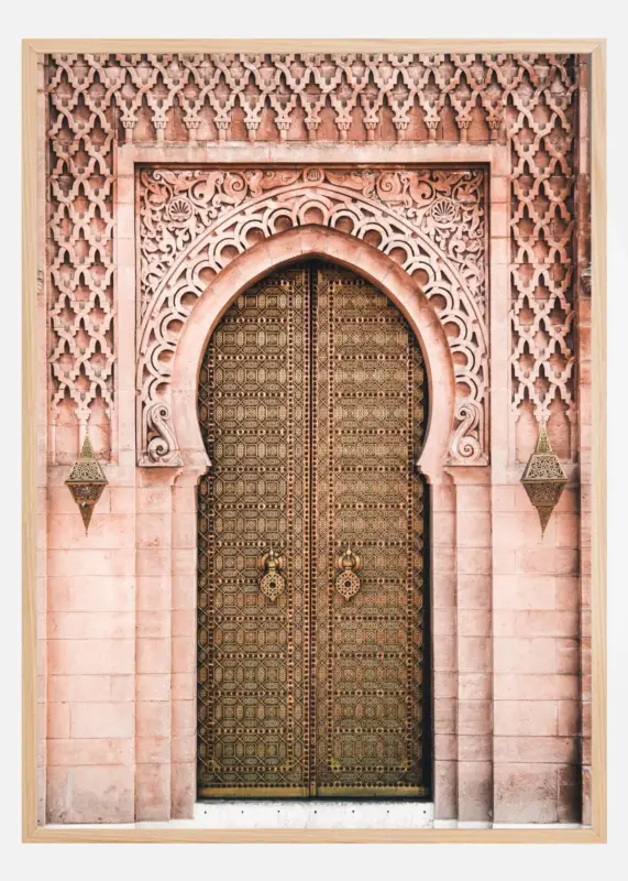 Een architectonische poster van een grote deur of koninklijke ingang. De rode betegelde muren zijn ingewikkeld ontworpen wanneer ze de rondingen van de gouden deuren omringen. Stel je voor wat er achter deze gouden deuren ligt als je deze prachtige poster in huis haalt.