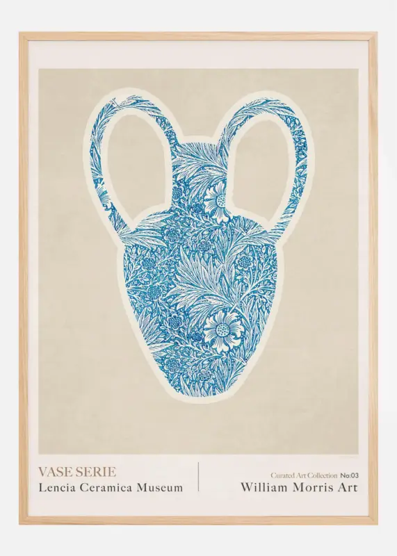 Deze kunstzinnige poster is nummer 03 in de “Curated Art Collection” van Lencia Ceramica Museum en is een subliem eerbetoon aan William Morris’ onmiskenbare gevoel voor patronen. Deze stijlvolle vaas is omgeven door een complex, blauw patroon dat wordt gekenmerkt door Morris’ liefde voor de natuur en zijn vermogen om levendige en organische vormen te creëren die doen denken aan een andere tijd.