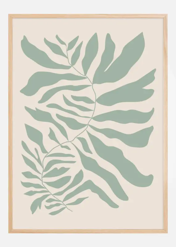 Met zijn frisse en strakke ontwerp biedt deze poster een afbeelding van groene bladeren tegen een rustgevende beige achtergrond. De organische lijnen en natuurlijke vormen brengen de kalmerende aanwezigheid van de natuur direct in je woonruimte of werkplek. Het kleurenpalet maakt gebruik van verschillende groentinten, van lichtere bladeren tot donkerdere contouren, wat een dynamisch maar harmonieus gevoel geeft. Deze print is een eerbetoon aan de eenvoudige schoonheid van de natuur en kan een vredig element toevoegen aan elke interieurstijl.