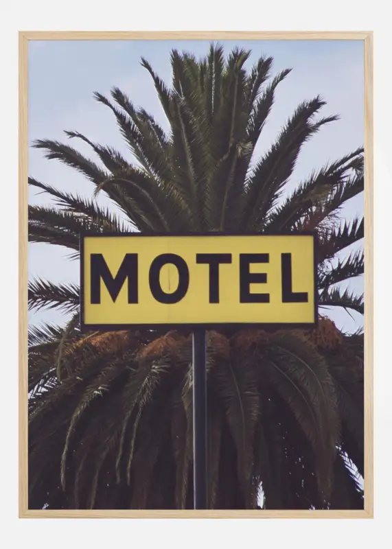 Een duidelijke poster van een motel wegwijzer voor een grote palmboom die de blauwe lucht omhelst. Het zwarte schrift is geschreven op het gele oppervlak van de poster. De grote palmboomtakken hebben verschillende kleuren bladeren, variërend van groen tot lichtbruin. Een perfecte hotel receptie poster.
