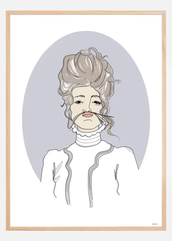 Een grappige poster van een Victoriaanse Vivvi die naar buiten kijkt, een lok haar als een snor over haar bovenlip gehouden. Dit meisje kijkt brutaal naar buiten met haar poezelige haar een beetje in de war. Haar gesteven blouse met hoog kraagje geeft een vleugje strengheid. Combineer deze poster met de Victoriaanse Violetta voor een leuke set aan je muur.