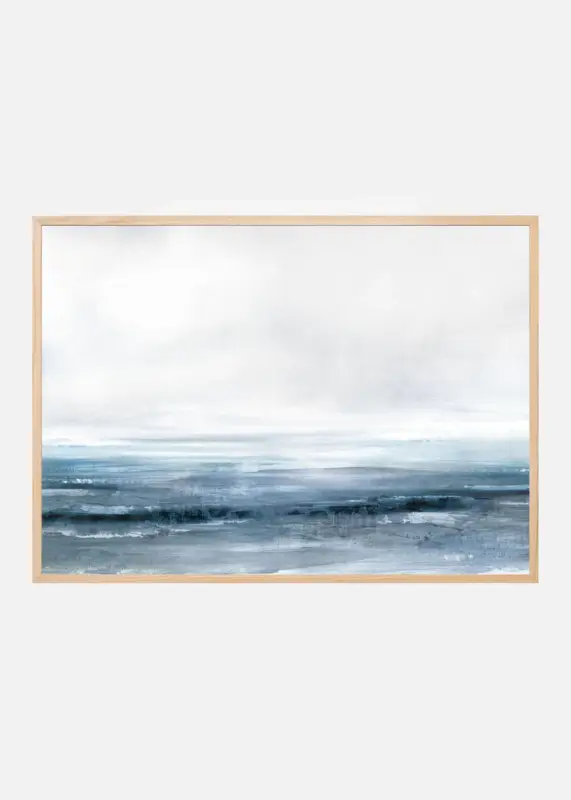 Deze poster vangt een stille en rustgevende zee-uitzicht die het gevoel van oneindigheid en diepte overbrengt. Het motief wordt gedomineerd door zachte, blauwe tinten in verschillende schakeringen die over het doek vloeien, wat het bewegende zeewater nabootst. De witte lucht draagt bij aan een gevoel van kalmte en stilte, terwijl subtiele accenten van grijs en donkerder blauw extra diepte en interesse geven aan de esthetische compositie van de print.