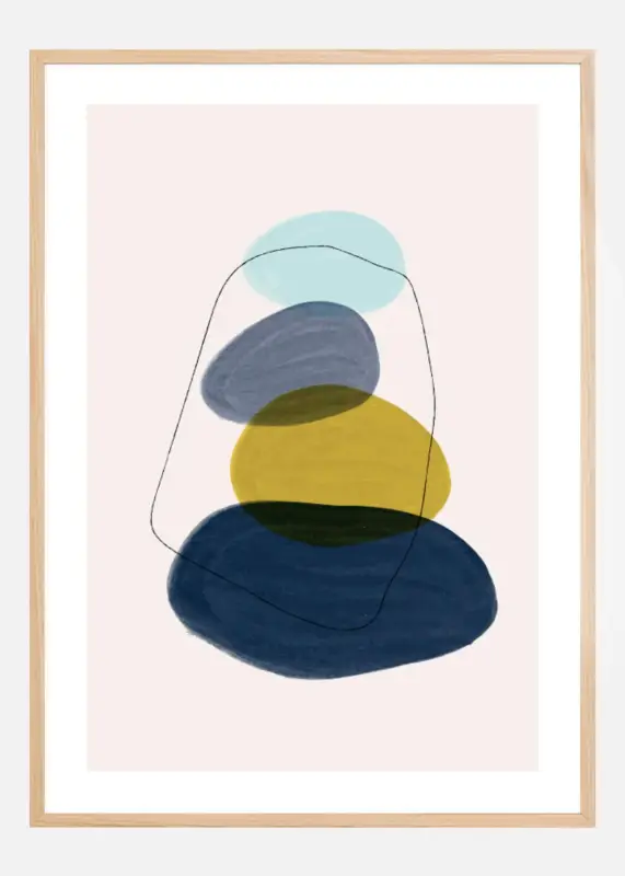 Een leuke abstracte poster van verschillende ronde vormen die op stenen lijken. De vormen beginnen groot en worden geleidelijk kleiner naarmate ze op elkaar gestapeld worden in deze leuke poster. De donkerblauwe, lichtblauwe en gele tinten van deze poster maken het tot een opbeurende poster voor je huis.