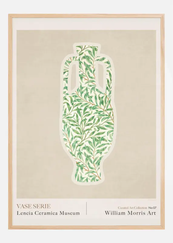 Deze delicate en door de natuur geïnspireerde poster is nummer 07 in onze “Curated Art Collection” van het Lencia Ceramica Museum, die het artistieke erfgoed van William Morris viert. Het toont een klassieke vaassilhouet, gevuld met een van Morris’ kenmerkende groene plantmotieven, wat zijn meesterlijke manier laat zien om vorm en functie te combineren met esthetische schoonheid in design. Het is een tijdloze ode aan Morris’ visie en zijn vermogen om inspiratie uit de natuur te halen en die om te zetten in kunst.