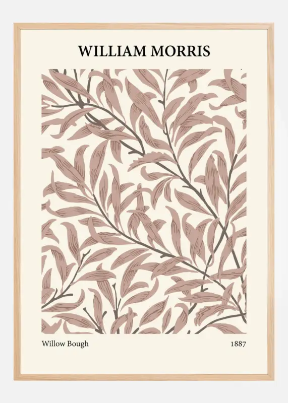 Dit posterontwerp eert William Morris’ “Willow Bough” uit 1887 en is een prachtige representatie van Morris’ toewijding aan natuurgetrouwe patronen. De sierlijk gevormde wilgenbladeren strekken zich uit over een crèmekleurige achtergrond en creëren een harmonisch contrast dat zowel kalmerend als esthetisch aantrekkelijk is. De bruine en beige tinten geven een warme uitstraling die typisch is voor Morris’ werk.