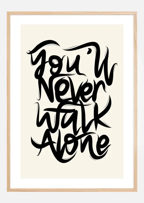 Deze krachtige poster presenteert een speelse en artistieke kalligrafie van de zin “You Never Walk Alone” in gezwarted tekst tegen een warme, roomkleurige achtergrond. De vloeiende en dynamische stijl van typografie toont de woorden die met elkaar verweven zijn, wat een uitdrukking geeft van beweging en samenhorigheid. Het ontwerp balanceert vakkundig tussen leesbaarheid en artistieke vrijheid, waardoor de tekst zowel een boodschapper als een esthetisch object op zichzelf is.