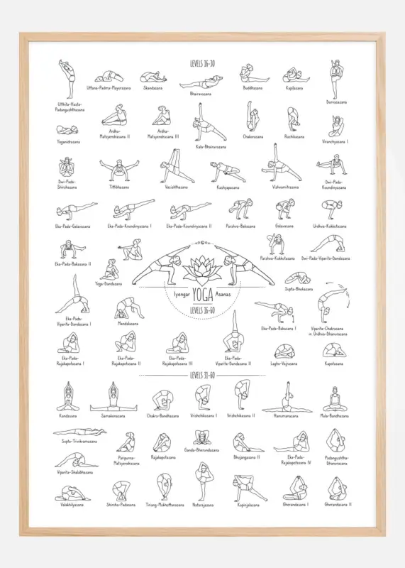 Gecentreerd en in focus op de poster is de titel ‘Iyengar YOGA Asanas’ en de moeilijkheidsgraden, wat aangeeft dat deze oefeningen afkomstig zijn van de specifieke yogavorm ontwikkeld door B.K.S. Iyengar. Deze educatieve poster is perfect voor een yoga-enthousiasteling die zijn of haar praktijk wil verdiepen en voor instructeurs die een visuele referentie in hun studio’s nodig hebben. Het schone en eenvoudige ontwerp maakt het een elegante en functionele decoratie, terwijl het een inspirerende en leerzame sfeer aan de ruimte toevoegt.