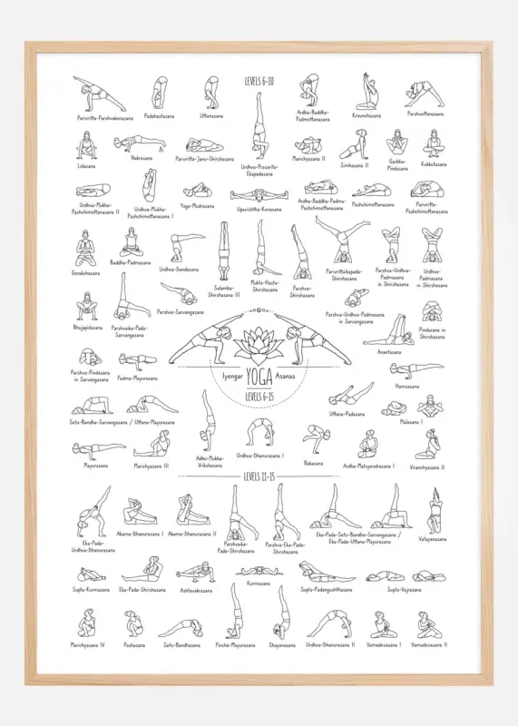Deze uitgebreide en instructieve poster biedt een visuele gids voor Iyengar Yoga Asanas voor niveau 6 tot 15, gepresenteerd in een heldere en methodische lay-out. De gedetailleerde illustraties zijn weergegeven met precieze lijnen die de unieke vormen en houdingen van elke yogapositie benadrukken. Boven elke afbeelding staat de naam van de asana in het Sanskriet, wat het gemakkelijk maakt voor beoefenaars van elk niveau om elke positie te herkennen en te oefenen.