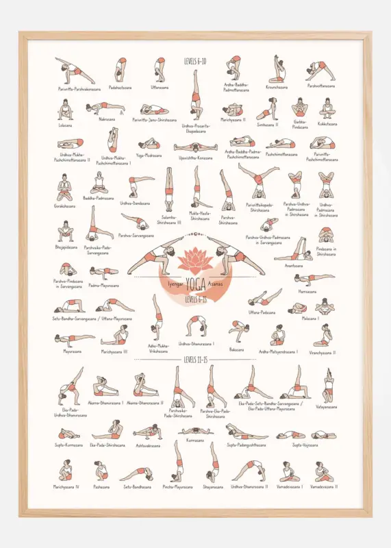 Deze gedetailleerde en kleurrijke yoga poster illustreert een uitgebreide verzameling van Iyengar Yoga asana’s van niveau 6 tot 15. Elke yogapositie is fijn geïllustreerd met warme, aangename kleuren die elke vorm en gebaar benadrukken, terwijl de duidelijk identificeerbare namen naast elke illustratie het gemakkelijk maken om te volgen en te oefenen. Het ontwerp is zowel functioneel als esthetisch, en creëert een uitnodigende sfeer voor yogabeoefenaars van alle kennisniveaus.